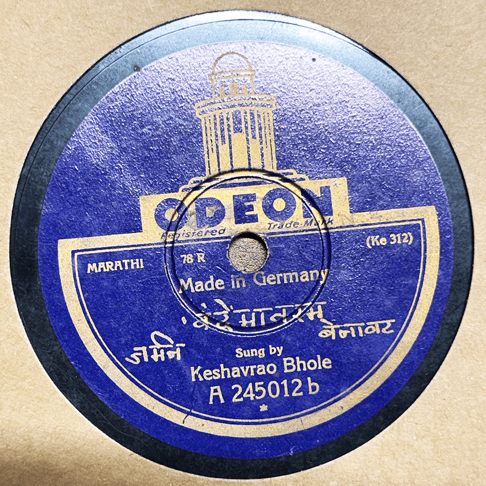 A rare 10.75-inch disc issued by the Odeon label, this recording features Vande Mataram sung by Shri Satya Bhushan Gupta of Calcutta, a renowned musicologist of his time. Gupt...